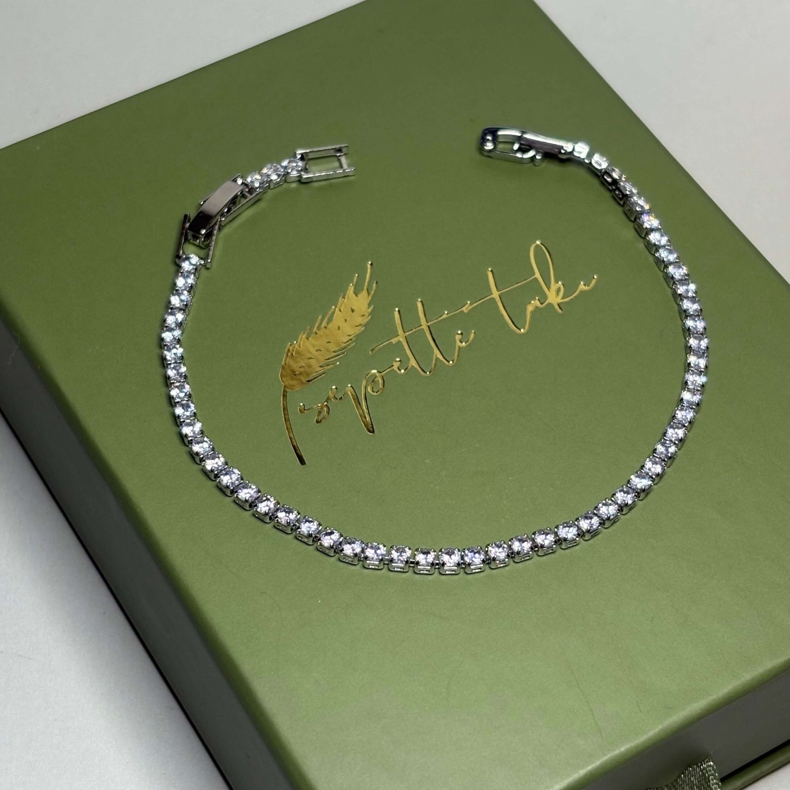 Tamamı taş detaylı tennis zincir formuyla ışığı güçlü şekilde yansıtan şık bileklik.